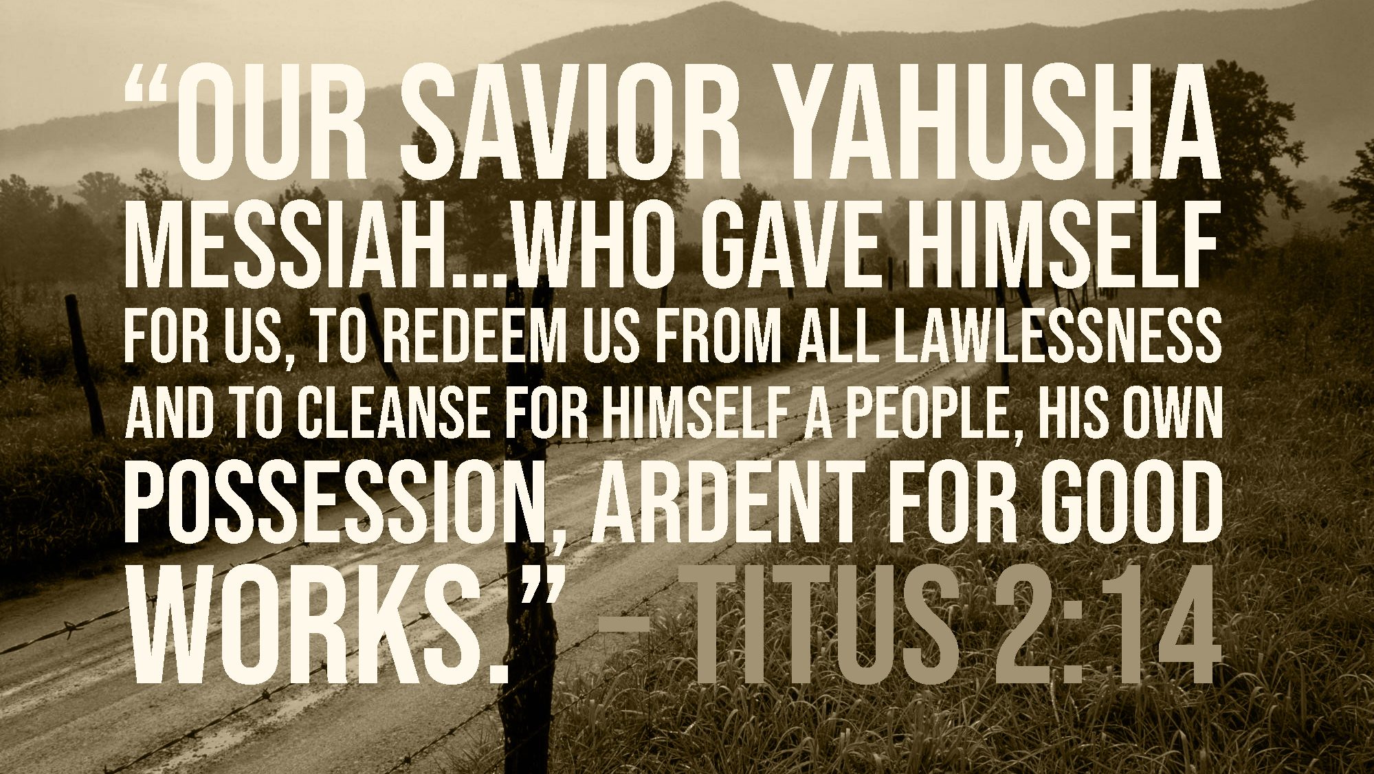 “Our Savior Yahusha Messiah…who gave Himself for us, to redeem us from all lawlessness and to cleanse for Himself a people, his own possession, ardent for good works.” – Titus 2:14